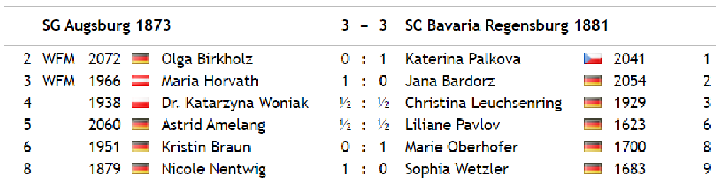 In der 2. Frauenbundesliga Süd hat KissChess die Tabellenführung souverän inne. In der Tabelle mit Blick nach unten befinden sich die Mannschaften, die mit ihren bestehenden Möglichkeiten das Beste aus dem Besten machen. Also wir! Das ist nicht wenig. Die Eigengewächse Liliane Pavlov, Marie Oberhofer und Sophia Wetzler kämpfen auf Augenhöhe mit vollem Einsatz für ihre Mannschaft. Sophia erwiderte auf den Hinweis, wie mutig sie ihre Angriffspartien angelegt habe, lakonisch – wohl etwas zu mutig. Nein und ja. Ich stimme ihr voll zu – wir wollen gewinnen und unsere Chancen nützen. Da darf auch ein und noch ein weiterer Angriff schief gehen. Um was geht es denn? Wir alle wünschen ein scharfes Schwert und spannende Partien. Unser Team hatte dieses Mal Katerina Palkova, Christina Leuchsenring und Jana Bardorz als Gastspielerinnen im Einsatz. Spielerinnen, die es wissen wollen. Alle wünschen, in der 2. Frauenbundesliga zu spielen, um ein gutes Ergebnis zu erzielen und um einfach dabei zu sein. Das ist Sportsgeist und ein Ideal.