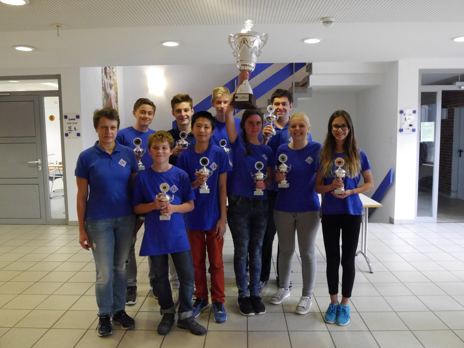 Jedes Jahr richtet die Niedersächsische Schachjugend um den Feiertag zur Deutschen Einheit die Deutschen Ländermeisterschaften aus. Auch in diesem Jahr fand das 5 Tage dauernde Turnier wieder an den ersten Oktobertagen in Hannover statt. Jedes Bundesland kann dabei ein Auswahlteam seiner besten Jugendlichen stellen. Dieses Jahr waren alle Bundesländer mit Ausnahme Brandenburgs mit ihren Teams vertreten. 3 Mädchen, je eins aus den Altersklassen U20w, U16w und U12w, und 5 Jungs aus den Altersklassen U20, U18, U16, U14 und U12 bilden dabei die achtköpfige Mannschaft. Die Teams der einzelnen Bundesländer kämpften dann nach den Regularien des Schweizer Systems 7 Runden lang, um schließlich den Deutschen Ländermeister 2016 zu küren. Cédric wurde als Vertreter der Altersklasse U16 von den bayerischen Auswahltrainern in das Team berufen. Nach 2014, als er damals in der Altersklasse U14 am Start war, durfte er dieses Jahr bereits zum zweitenmal an diesen Titelkämpfen teilnehmen. Das Team Bayern mit FM Florian Ott (SC Forchheim), Johannes Mann (SK Schweinfurt ), Cédric Oberhofer (SC Bavaria Regensburg), Jana Schneider (Spvgg Stetten), Kevin Tong (SC Erlangen), Jon Englert (TV Großostheim), Kirstin Braun (SC Forchheim), Vitalia Khamenya (SK Gräfelfing) und Ersatzspieler Simon Leeb (SK München Südost) ging als Titelverteidiger an den Start. Jedoch waren die Mannschaften aus Schleswig-Holstein und Baden als die beiden Ersten der Setzliste etwas höher einzuschätzen als das bayerische Team, welches das Turnier als Ranglistendritter begann. Zum Turnierauftakt gelang dann ein überzeugender 7,5:0,5 Sieg gegen Berlin. Am zweiten Turniertag hieß der erste Gegner Sachsen. Nach hartem Kampf gelang auch hier ein knapper 5:3 Sieg. Der Nachmittag brachte dann einen spannenden Wettkampf gegen die starke Mannschaft aus Hessen. Mit dem 4:4 musste das bayerische Team dabei allerdings den ersten Punktverlust verdauen. Eine Vorentscheidung im Titelkampf brachten dann die beiden Duelle am Tag der deutschen Einheit. Das Team Bayern feierte an diesem Feiertag zwei 5:3 Siege gegen die beiden Ersten der Setzliste aus Schleswig-Holstein und Baden. Vor den beiden Schlußrunden standen die Bayern damit mit 9:1 Punkten an der Tabellenspitze. Nur das hessische Team konnte mit der gleichen Punktzahl noch Schritt halten. In der vorletzten Runde folgte dann das erwartet harte Duell gegen Rheinland-Pfalz, bei denen der deutsche Shooting Star der jugendlichen Schachszene, der erst zwölfjährige Vincent Keymer, am 2. Brett alle 7 Partien gewann. Am Ende gelang es mit einem 4:4 die Rheinland-Pfälzer auf Distanz zu halten. Die gleichzeitige Niederlage des hessischen Teams bescherte den Bayern vor der Schlußrunde einen Punkt Vorsprung vor den Konkurrenten. Mit einem souveränen und nie gefährdeten 6,5:1,5 Sieg gegen Württemberg krönten sich die bayerischen Nachwuchshoffnungen zum DEUTSCHEN LÄNDERMEISTER 2016 und feierten die erfolgreiche Titelverteidigung. Ein grandioser Erfolg auch für die Nachwuchsarbeit unseres Vereins, für die Cédric stellvertretend für viele starke aufstrebende Jugendliche diesen tollen persönlichen Erfolg feiern darf. Herzlichen Glückwunsch!