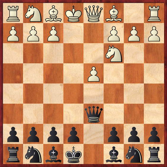 4. … Lf5, das sein Gegner korrekt mit 5.Df3 De6+ 6.Le3 zu einer für Weiß vorteilhaften Stellung beantwortete. Der Druck erst auf b7 und dann f7 führte nach und nach zum Verlust der Partie. Ausgleich.