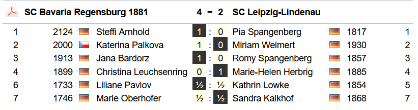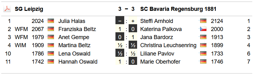 Marie Oberhofer steuerte nach ihrem Fauxpas vom Vortag in einer spannungsarmen ausgeglichenen Partie ein sicheres Remis zum Mannschaftserfolg bei. Groß war dann die Freude im Lager der Regensburgerinnen, als Liliane Pavlov zum Zwischenstand von 3:2 remisierte und damit ihrem Team den Klassenerhalt sicherte. Lange hatte die Leipzigerin in einem ausgelichenen Endspiel versucht, sich Vorteile zu erkämpfen, musste aber letztendlich der Punkteteilung zustimmen.