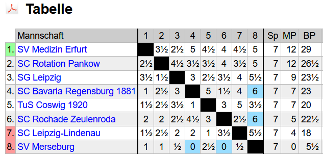 Lange Zeit schienen die Leipzigerinnen als sicherer zweiter Absteiger neben dem Team von Merseburg, doch zwei Siege in Folge hatten sie vor der letzten Runde wieder in Schlagdistanz im Abstiegskampf gebracht. Ein Sieg gegen Bavaria und sie hätten sich gerettet und die Bavarianerinnen gleichzeitig zum Abstieg verurteilt. Ein echtes Endspiel wartete auf unsere Frauen, die darin aber schon Erfahrung hatten. Denn auch in der letzten Saison gelang erst mit einem Erfolg in der Schlussrunde der Klassenerhalt. Während an den Spitzenbrettern Bavaria sich leichte Vorteile ausrechnete, schien der Ausgang der Partien an den hinteren Brettern völlig offen.