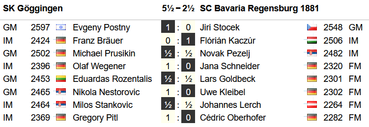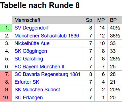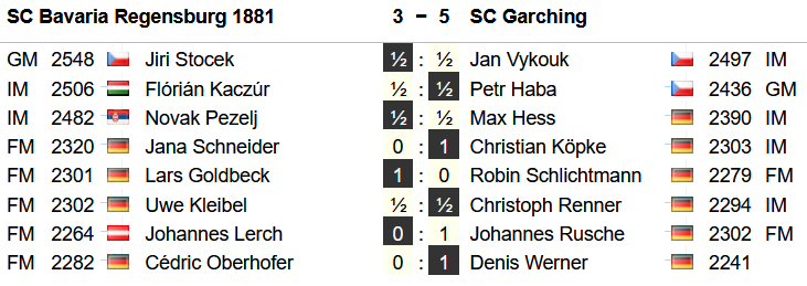 Damit besteht für die Regensburger vor dem abschließenden Match gegen den ausschließlich mit Großmeistern spielenden aktuellen Spitzenreiter Deggendorf nur noch eine theoretische Chance auf den Klassenerhalt. Die beiden knappen und durchaus unglücklichen Niederlagen gegen die direkten Konkurrenten Garching und Bayern München 2 waren schließlich wohl entscheidend.