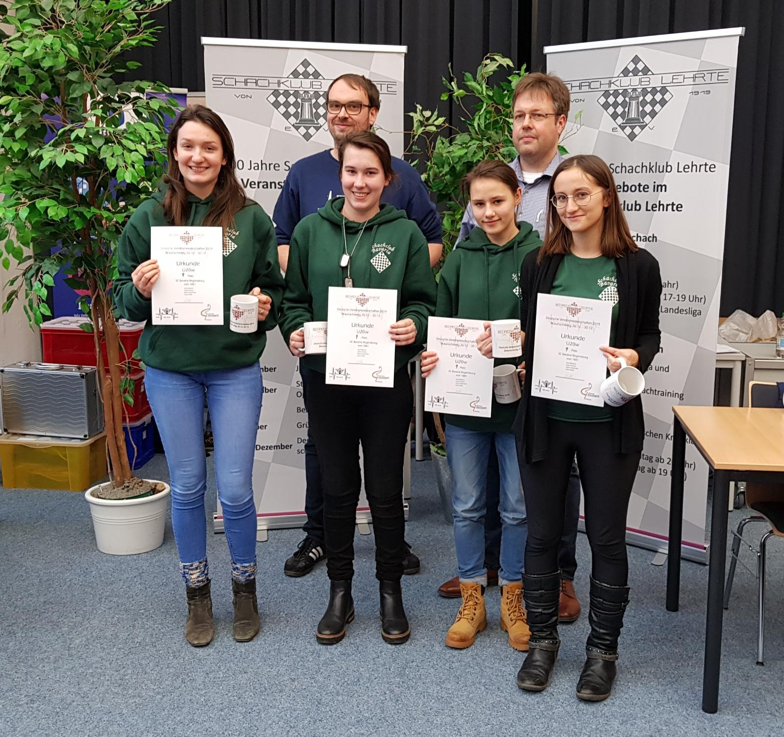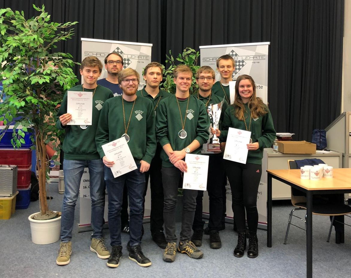 In der letzten Runde bekamen wir den Zweitgesetzten, aber nicht ganz erfolgreich agierenden, SF Brackel aus Dortmund zugelost. Man hätte sich einfachere Gegner vorstellen können, aber so konnten wir alle nochmal zeigen, dass wir uns den dritten Platz wirklich verdient hatten. Dass Hamburg oder Magdeburg noch patzten, war sehr unwahrscheinlich, also war der dritte Platz das Beste, was wir erreichen konnten. Mit einem Sieg wäre der Platz auf dem Podium gesichert. Zwei der Brackeler kamen zehn Minuten zu spät, sie hatten laut eigener Aussage noch einen verloren gegangenen Schuh gesucht. Nach der 0-Karenz-Regel bekamen beide eine Zeitstrafe von 15 Minuten plus die Zeit, die sie zu spät kamen. Die Partie wäre aber erst ab einer Verspätung von 15 Minuten verloren gegangen. Janas Gegner fehlte diese Zeit am Ende, als er in Zeitnot einen Springer einstellte. Eric gewann seine letzte Partie in der Jugend souverän und beendete so seine Zeit als U20-Spieler mit einem super Abschlussturnier und einem Abschlusssieg. Bei Lars dagegen wollte es nicht mehr laufen und er verlor seine letzte Partie in 2019. Möge das neue Jahrzehnt besser werden! Cédrics Partie endete unspektakulär in einem remisen Turmendspiel. Georg und Elias ließen ihre Gegner aus gewonnener Stellung heraus noch ins Remis entwischen. Endergebnis 3,5:2,5 für den SC Bavaria Regensburg. Das hieß für uns, 3. Platz mit drei Mannschaftspunkten Vorsprung auf den Viertplatzierten Lehrte. Der erste Platz ging an die glücklichen Hamburger, die nicht nur die U20 gewannen. Silber verdiente sich Magdeburg.
