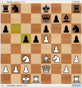 Mika hatte in der Panov-Variante der Caro-Kann Verteidigung wie Naum ebenfalls sehr schnell eine sehr komplizierte Stellung erreicht. Sein Gegner hatte einen Turm für einen Springer geopfert hatte jedoch dafür einen weit vorgerückten Freibauern erhalten. Aufgrund der vielen Varianten die Mika berechnet hatte geriet er in Zeitnot und verlor im 39.Zug auf Zeit. Zumindest dachten alle das. Der Schiedsrichter entschied jedoch das die Partie weitergespielt werden soll, nur um die Partie eine halbe Stunde später wieder abzubrechen und für den Gegner für gewonnen zu erklären. Leider wurde im Zuge dieser Entscheidung davor noch unser Mannschaftsführer davor aus dem Turniersaal geschickt um eine andere Person zu suchen. Die Entscheidung die laufende Partie erneut abzubrechen erachten wir als zweifelhaft, vor allem in einem Jugendturnier. Jedoch akzeptierten wir die Entscheidung der Schiedsrichter, welche sich für den Ablauf der Dinge im folgenden auch entschuldigten. Der Mannschaftskampf war bereits ebenfalls für uns verloren.