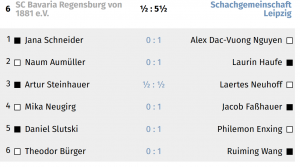Wir verloren den Kampf mit 5,5 zu 0,5. Aufgrund des Partieverlaufs eindeutig zu hoch, jedoch trotzdem Glückwunsch an die SG Leipzig. Unsere jungen und unerfahrenen Spieler zahlten in dieser Runde einiges an Lehrgeld, jedoch haben Sie sicher viel aus Ihren Partien gelernt.