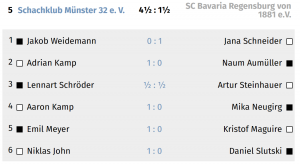 So verloren wir mit 4,5 zu 1,5 gegen den Gastgeber aus Münster. Ein wenig zu hoch, hatten wir in diesem Kampf durchaus unsere Chancen gehabt. Aber trotzdem Glückwunsch an die Heimmannschaft.