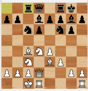 Jana spielte am Spitzenbrett gegen einen Fidemeister aus Leipzig. Dieser begang in der katalanischen Eröffnung eine bekannte Ungenauigkeit mit den weißen Steinen. Wieso ist 10.Sc3 hier ungenau? (Lösung am Ende des Berichts)(Diese Ungenauigkeit ist dem Autor dieses Berichts auch bereits in einer Turnierpartie unterlaufen…)