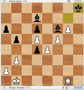 Zwar hatte Naum es wieder mit einem starken Gegner zu tun, welchem er lange Paroli bot, sich letztendlich leider doch geschlagen geben musste, als ein gegnerischer Freibauer kurz vor einer Umwandlung zu einer Dame war. So stand es 2,5 zu 2,5 und Arturs Partie sollte über den Mannschaftskampf entscheiden. Jedoch sahen unsere Chancen hier lange Zeit sehr gut aus, hatte bereits früh in der Partie einen Bauern gewonnen und hatte dann in ein gewonnenes Turmendspiel abgeleitet. Ausgerechnet in diesem Turmendspiel begannen bei unseren Spieler hier die Nerven zu flattern und er verpasste (auch zum Leidwesen der zuschauenden Mannschaftsführer und Betreuers) einige klare Gewinnmöglichkeiten, wodurch letztendlich folgende Stellung entstand: