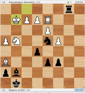 Mehr Probleme hatte Kristof mit den schwarzen Steinen in der englischen Eröffnung. Seine Figuren fanden nicht immer den besten Platz und Weiß stand ein wenig besser. Nachdem auch noch ein Bauern verloren ging hatten wir zunächst wenig Hoffnung, jedoch kämpfte sich Kristof stark zurück. Wie konnte er hier in Zeitnot seinen Bauern zurück gewinnen? (Lösung am Ende des Berichts, mit genauem Spiel kann Weiß seinen Bauern behalten, ist jedoch in Zeitnot nicht so einfach zu finden. Stellen Sie den Weißspieler vor Probleme)