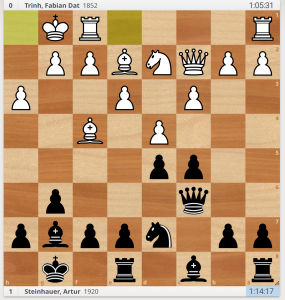 Besser erging es Artur nachdem sein Gegner in der Eröffnung mit 12. 0-0 einen groben Fehler beging. Wie konnte Artur mit den schwarzen Figuren diesen Zug hier ausnutzen? (Lösung am Ende des Berichts)