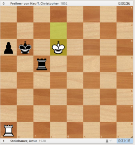 Unser jüngster Theodor spielte eine starke Angriffspartie und brachte seinen deutlich älteren Gegner sichtlich in Verzweiflung. Ein gewonnenes Endspiel spielte er zunächst sehr stark. Wie ist hier der weiße Gewinnplan? (Lösung am Ende des Berichts)