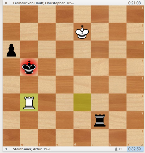 Was ist hier der einzige Gewinnplan für Schwarz? (Lösung am Ende des Berichts) Leider fand unser Spieler nicht die genausten Züge und die Stellung driftete in eine bekannte theoretische Remisstellung ab. Zu unserem Glück begang der Gegner noch einen entscheidenden Fehler. Der weiße König zog im letzten Zug nach e3. Wie konnte Artur die Stellung gewinnen? (Lösung am Ende des Berichts)