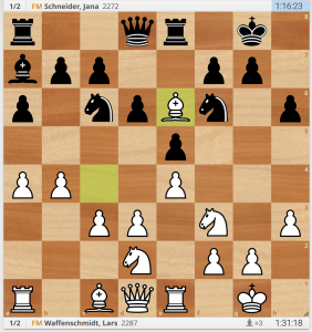 Am Spitzenbrett spielte Jana mit den schwarzen Figuren gegen den gegnerischen Fidemeister Lars Waffenschmidt. So unorthodox wie die Partie in der Vorbereitung auch erwartet wurde, wurde es nur ein sehr ruhige Stellung in einer geschlossenen italienischen Eröffnung. Sie versuchte mit folgenden instruktiven Turmschwenk einen Königsangriff zu beginnen: