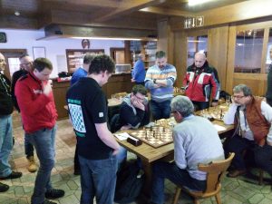 Es stand 4:3 und Pierre Tassell spielte an Brett 6 die letzte Partie. Ein Endspiel mit 4 Läufern und vielen Bauern – irgendwie muss man jetzt die Stellung öffnen und einen Bauerndurchbruch schaffen. Das erste klappte, das zweite schien unmöglich. Aber dann stellte Pierre geschickte Fallen auf, so dass er irgenwie doch einen Bauern zur Umwandlung brachte und die Partie gewann. Ein Sieg war drin, am Ende war das Unentschieden glücklich, aber nicht unverdient. In der Tabelle ziehen wir einen Platz nach vorne und stehen jetzt auf Platz 8.