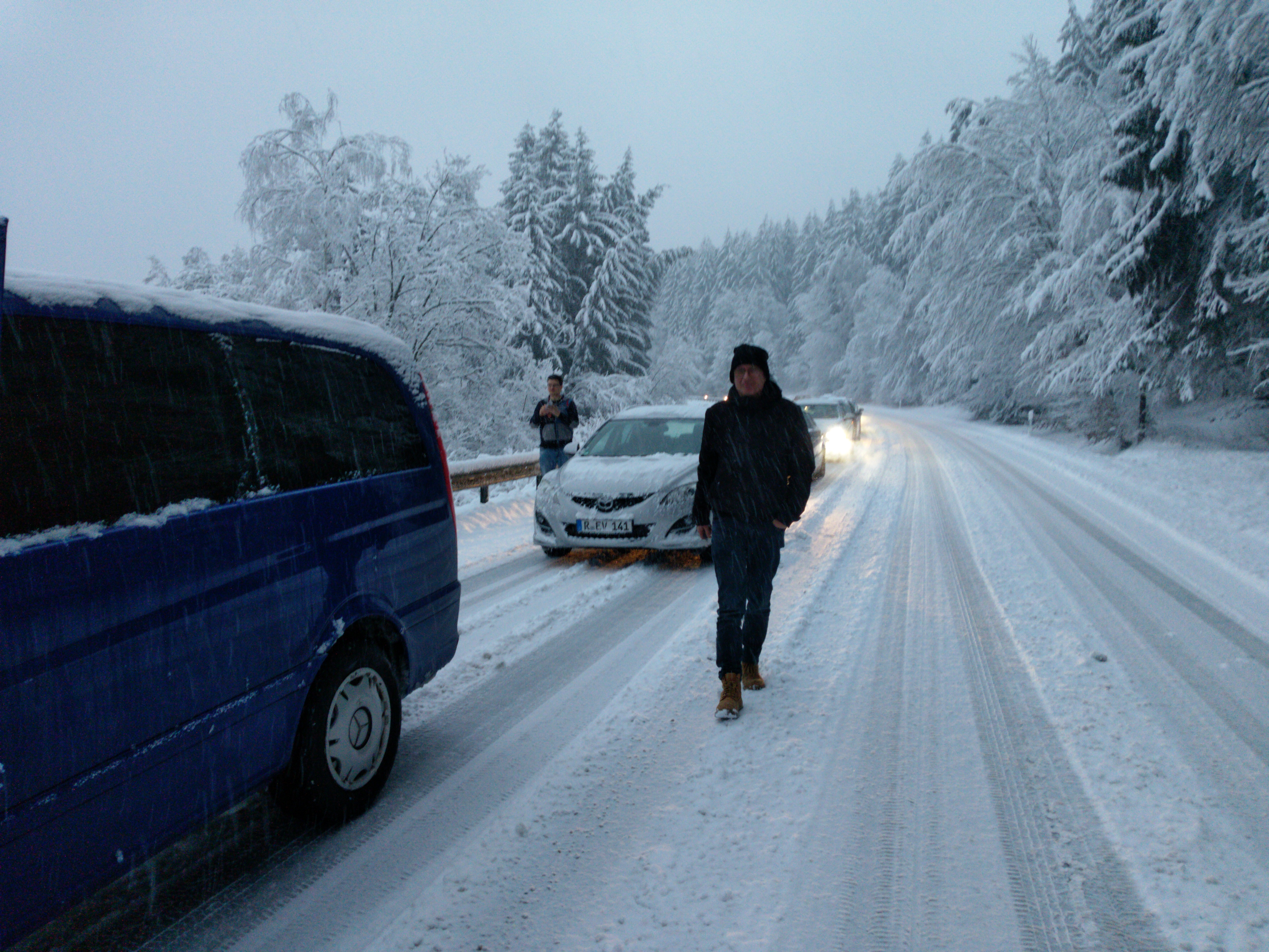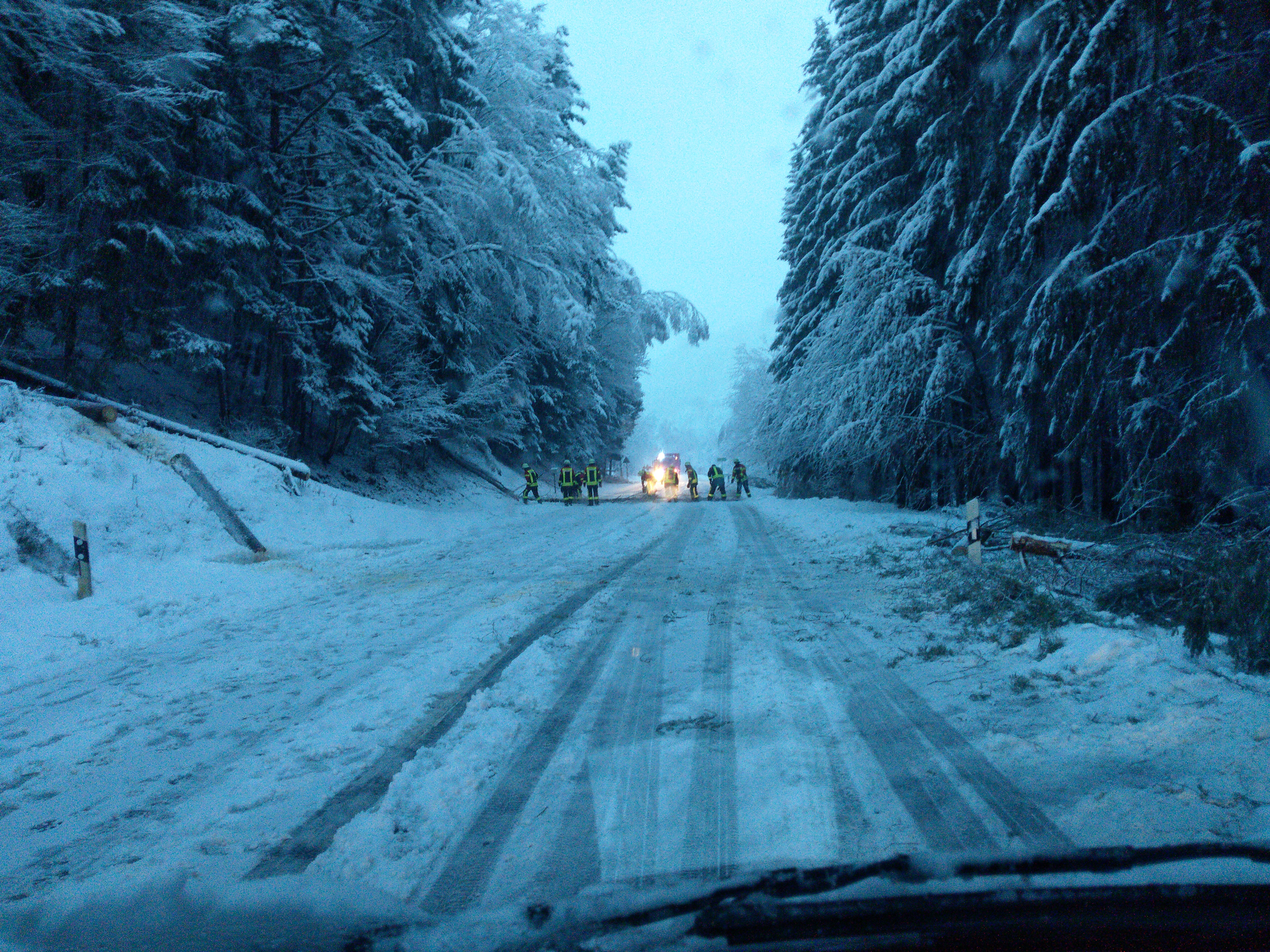 Hatten wir bei der Hinfahrt ca. 1 Stunde länger gebraucht, so kamen bei der Rückfahrt nochmal ca. 2 ungeplante Stunden dazu. Etwa fünf umgestürzte und weitere einsturzgefährdete Bäume lagen uns im Weg, aber mehrere Feuerwehrtrupps und viel Geduld halfen uns dann doch noch, Regensburg um ca. 19 Uhr zu erreichen, wo wir unsere geparkten Autos dann aber auch erstmal aus über 20 cm Schnee freischaufeln mussten.