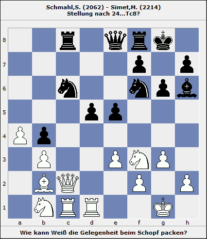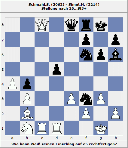 25.Sxe5! war ein Blitz aus heiterem Himmel und hatte das Potential sein zögerliches Spiel zu bestrafen. Nach der Folge 25…Sxe5 26.Dxc8 Sf3+ war es nun an mir den Einschlag auf e5 zu rechtfertigen, doch leider griff ich daneben und diesmal entscheidend: